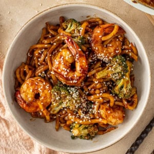 Inspired by my favourite takeaway dish, these 15 minute garlic prawn noodles come together quicker than you can decide what to order! With thick and chewy udon noodles coated in a rich oyster sauce with broccoli and prawns, this is one of my favourite easy meals to make midweek.