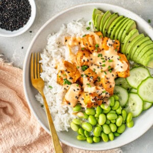 Serving Suggestion: If you want to serve these as bang bang salmon bowls as I have done, then you’ll also need some edamame (I just buy the packet of frozen, shelled edamame from the freezer section), avocado, cucumber, and some cooked rice.