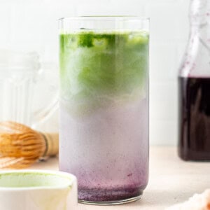 This iced blueberry matcha latte is a pretty, cafe-style drink that is really easy to make at home. Starting with a homemade blueberry syrup flavoured with maple syrup, vanilla and cinnamon, it’s the perfect way to switch up your mornings with a fun and delicious drink. I mean just look at those beautiful soft swirls of purple and green!