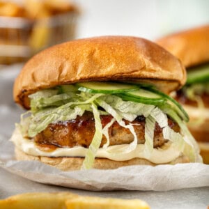 These chicken teriyaki burgers are super simple to make and come together in just 30 minutes! They are made with juicy grilled chicken patties coated in a sweet and sticky teriyaki glaze and served on a toasted bun with lettuce, mayo and the easiest pickled cucumbers.