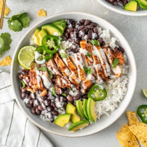 Finally, it’s time to assemble the bowls! Divide the cooked rice between four bowls and top each with black beans, sliced chicken thighs, and avocado. Drizzle with the mayo and serve immediately with corn chips or any other toppings you like.