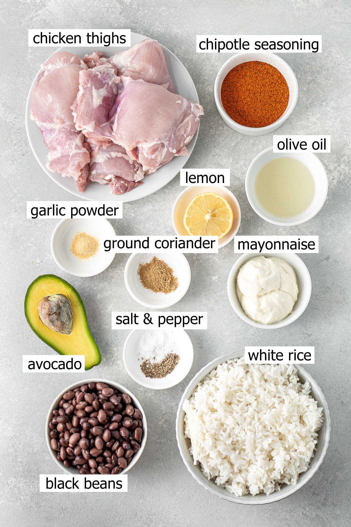 - Divide the cooked rice between four bowls. Top each with black beans, sliced chicken thighs, and avocado. Drizzle with the mayo and serve with corn chips immediately.