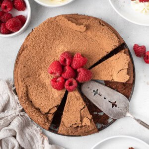 Step 6: Allow the cake to cool completely in the pan before releasing the sides. It will sink considerably as it cools which is normal and gives it that crinkly top. Dust with cocoa powder and serve with fresh raspberries.