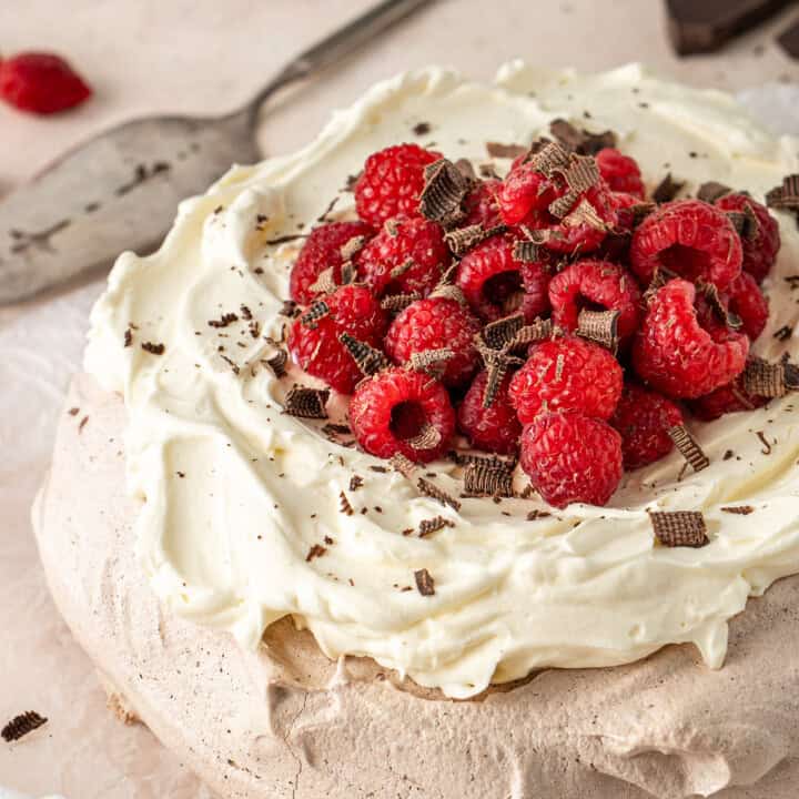 My Dad used to make this chocolate pavlova for every single special occasion when I was growing up! It has a crisp and chewy chocolate meringue filled with rich pockets of dark chocolate, layered with whipped cream and fresh raspberries. It's the perfect extra special and decadent twist on this Aussie summer classic.