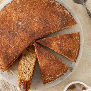 Step 4: While the cake is still warm, brush the top generously with melted dairy free butter and sprinkle it with cinnamon sugar.