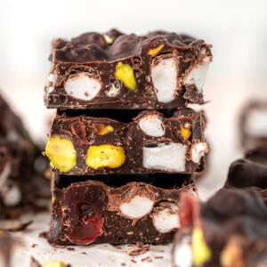 Everyone loves this easy rocky road recipe! This is my go-to version that I make every single December. With rich dark chocolate and loaded with mini marshmallows, glace cherries, and crunchy pistachios, it’s a family favourite that’s perfect for sharing at home, taking to family events, or simply enjoying whenever you need a sweet treat.