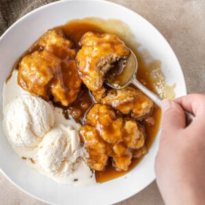 Full disclaimer, if you didn’t get it from the title of this recipe, this is a sweet dessert. The soft and pillowy dumplings are swimming in a thick and sticky butterscotchy, golden syrup sauce. You really need to be serving these with a scoop of dairy free vanilla ice cream which will really cut through that sweetness and balance it out.