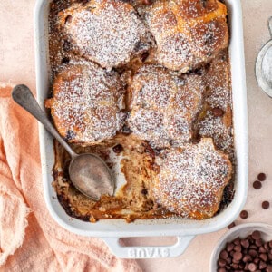 There is nothing more indulgent than making this hot cross bun bread and butter pudding with your leftover or stale hot cross buns this Easter. This is a twist on a classic bread and butter pudding and is warm, spiced and the perfect rich and comforting dessert to share.