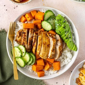 Divide up your cooked rice into your serving bowls or meal prep containers. Top with the roasted sweet potatoes and sliced chicken. Add your pickled cucumber, a little sliced avocado if you like and then drizzle everything generously with the hot honey. I like to add a few sesame seeds to finish but that’s completely optional.