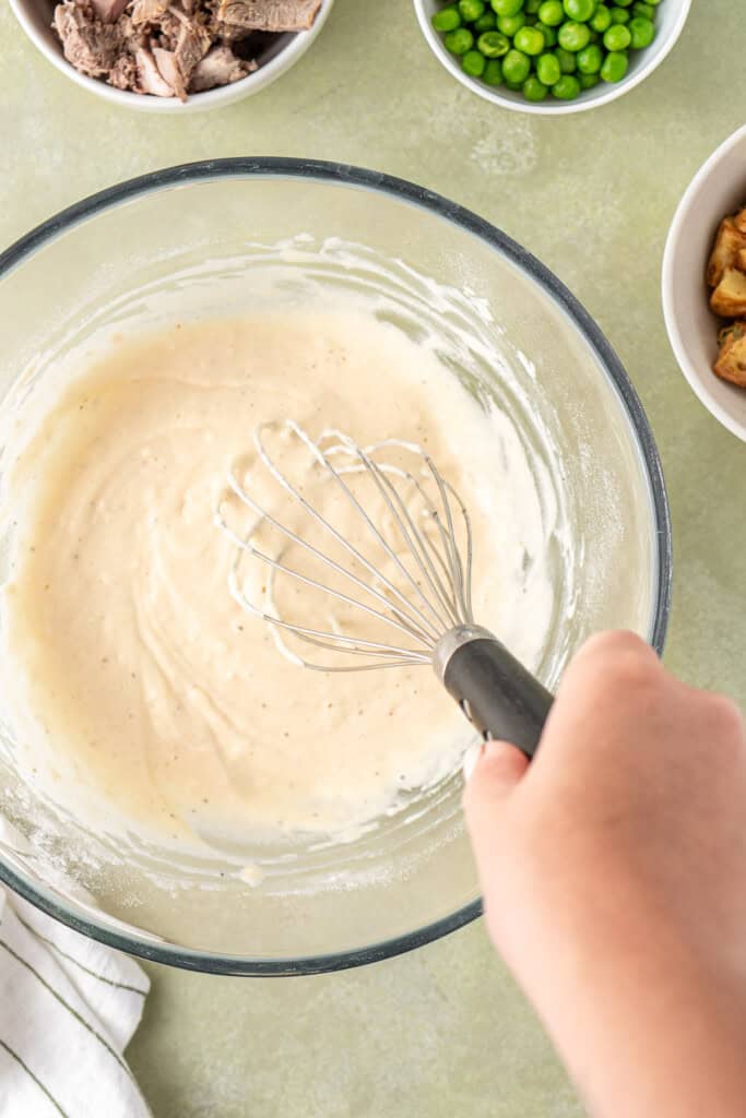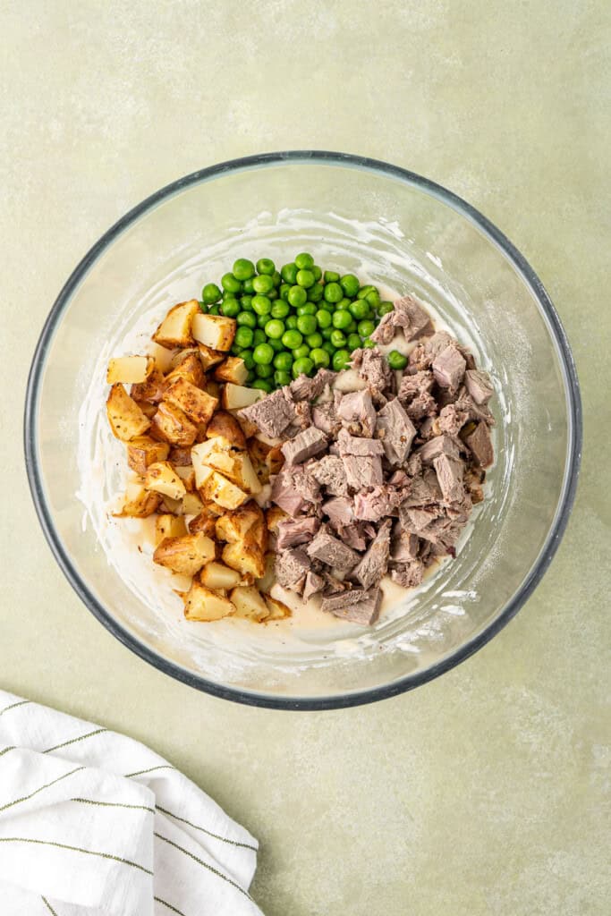 - Vegetables – you can get creative with what you add here, but to use up the leftovers from a roast dinner, I add in peas and chopped roast potatoes.
