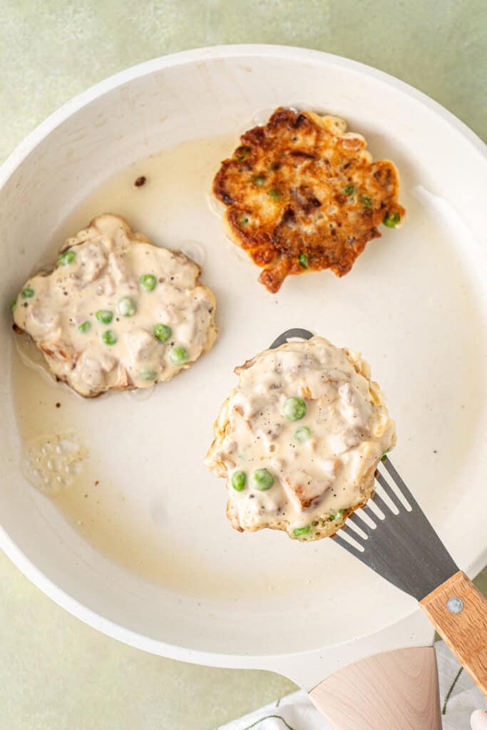 - Cook until the bottom is golden brown, about 3 minutes, then flip and cook the other side for another 2 minutes until golden and cooked through.