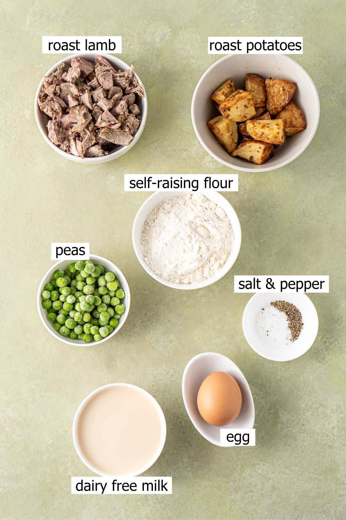 - In a large bowl, whisk together the flour, salt, and pepper. Add the egg and dairy free milk, then whisk until a thick batter forms. Stir in the diced lamb, cooked peas and potatoes until evenly combined.