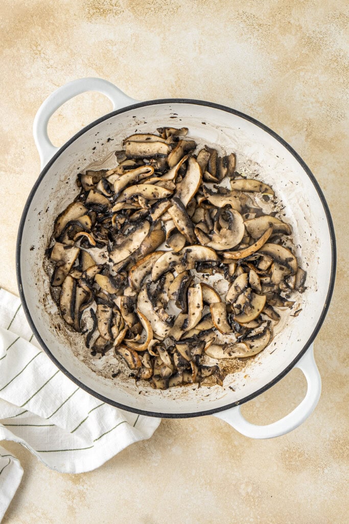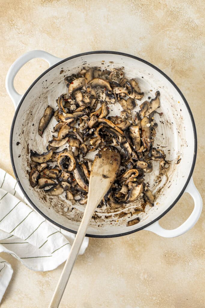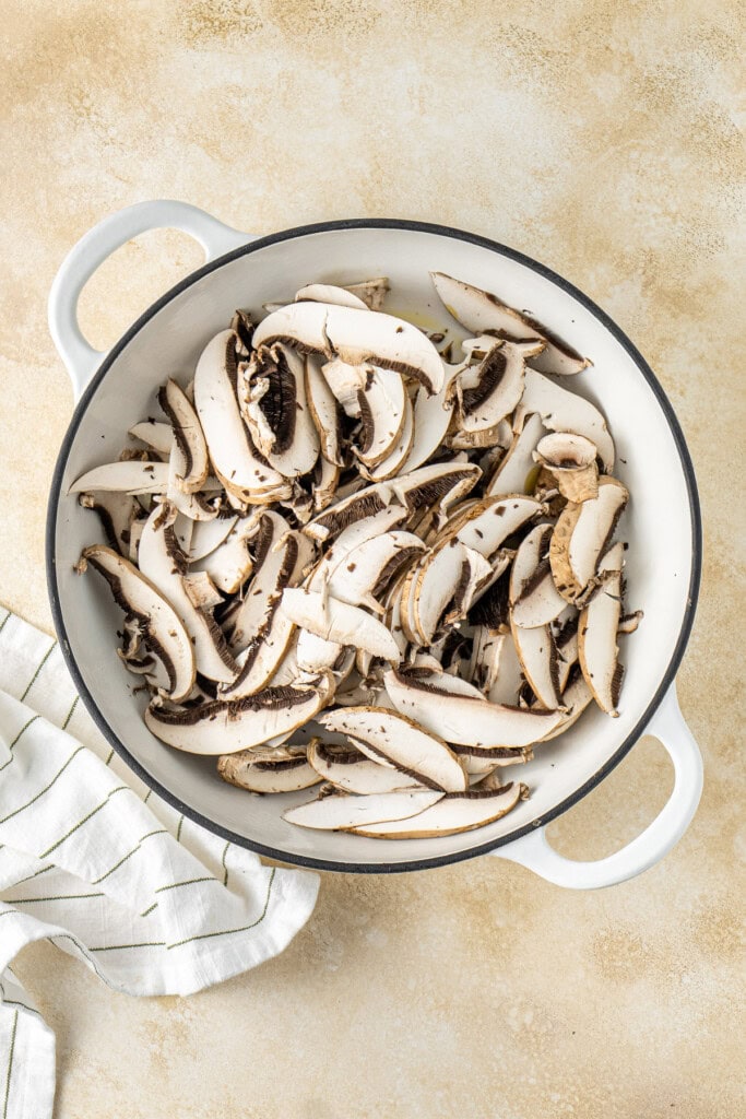 Step 2: Cook the mushrooms. While the pasta is cooking, heat 2 tablespoons of olive oil in a large frying pan over high heat. Add the sliced mushrooms and cook, stirring regularly, for 5–7 minutes or until the mushrooms are soft, well browned, and reduced in size by about a third.