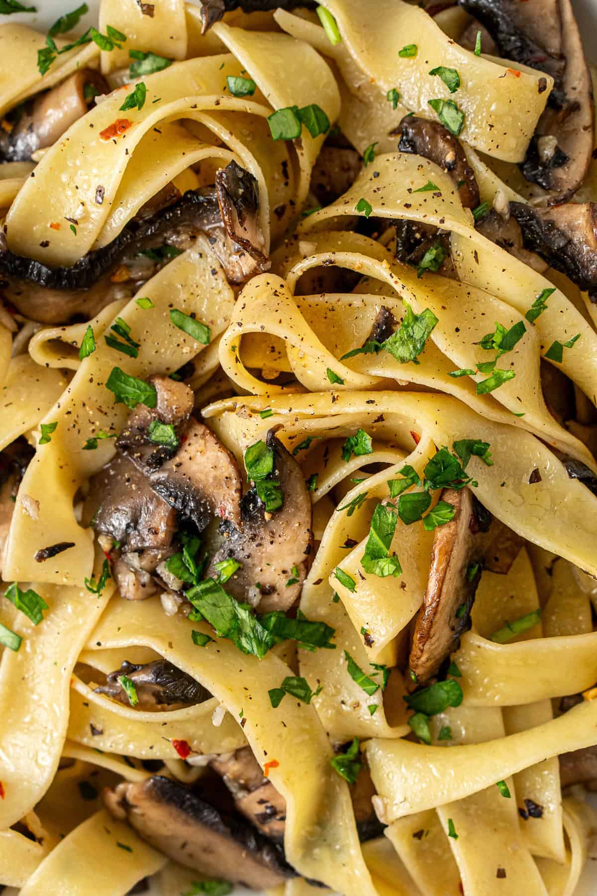 Step 4: Combine everything together. Add the drained pasta and fresh parsley to the mushroom mixture. Drizzle over an additional 2 tablespoons of olive oil and toss well to combine. Add the reserved pasta water, a little at a time, tossing continuously, until the pasta is lightly coated in a silky sauce.