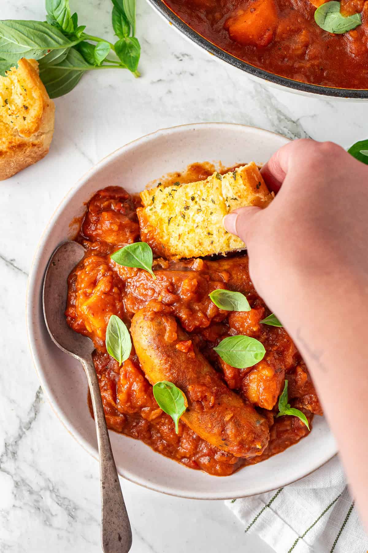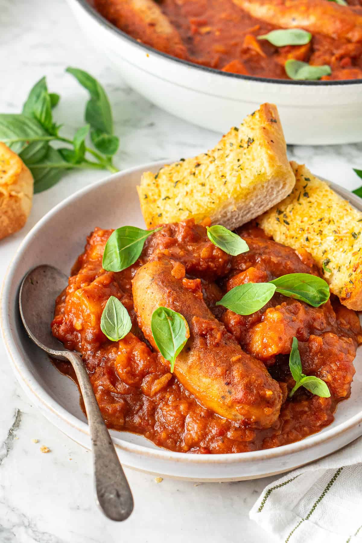 When testing this recipe I made a version in the oven and it took a lot longer to cook and I just didn’t like the results as much. I find with the stove top method everything breaks down a little more as it cooks in liquid (does this make it a braise?) and the result is buttery soft sausages full of flavour and a thick and rich sauce just asking to be scooped up with a thick slice of toasted garlic bread.