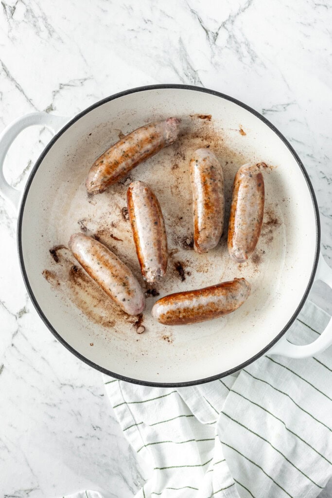 - Heat a small amount of olive oil in a heavy based casserole pot on medium-high heat and add the sausages. Fry them until brown, they don’t have to be cooked through, and then remove them from the pan and set aside.