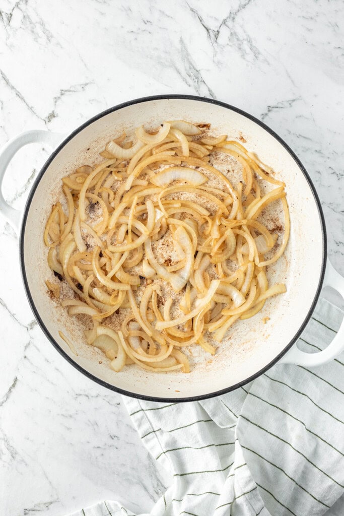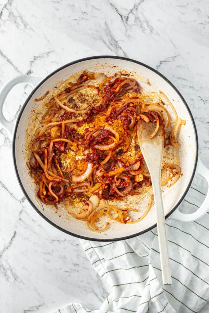 - To the same pan, add the sliced onions and cook for a few minutes, stirring occasionally with a wooden spoon until the onions have softened and browned. Add the garlic, tomato paste and spices and mix through for another minute.