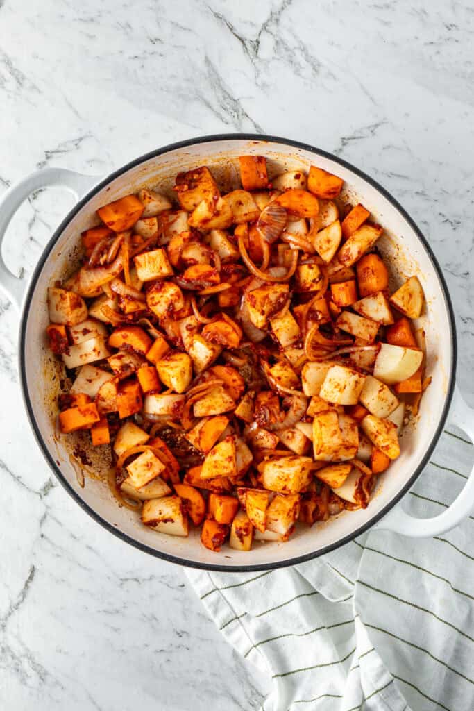 - Add in the potatoes and carrots to thepot and cook with the tomato paste and onions for a couple of minutes, mixing well so that the vegetables are coated.