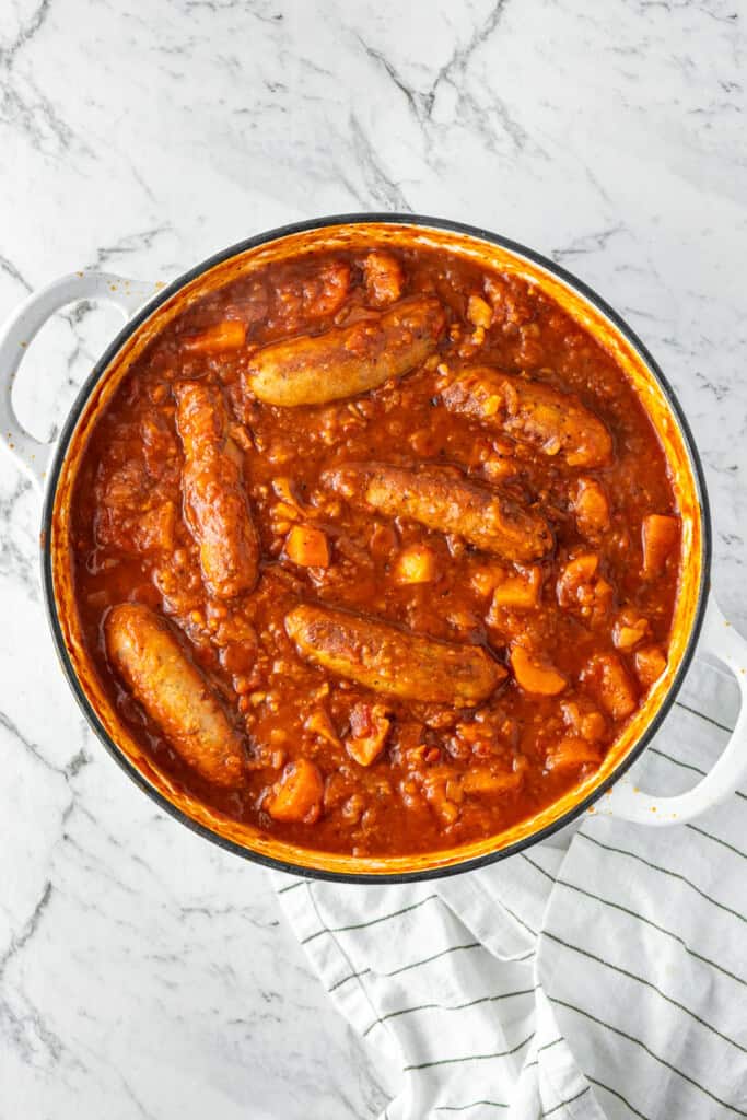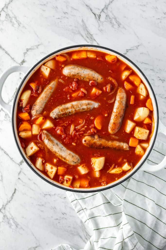 - Finally, add back in the sausages and bring to the boil. Turn down the heat to a gentle simmer and place the lid on to cook for 30-40 minutes or until the potatoes are soft.
