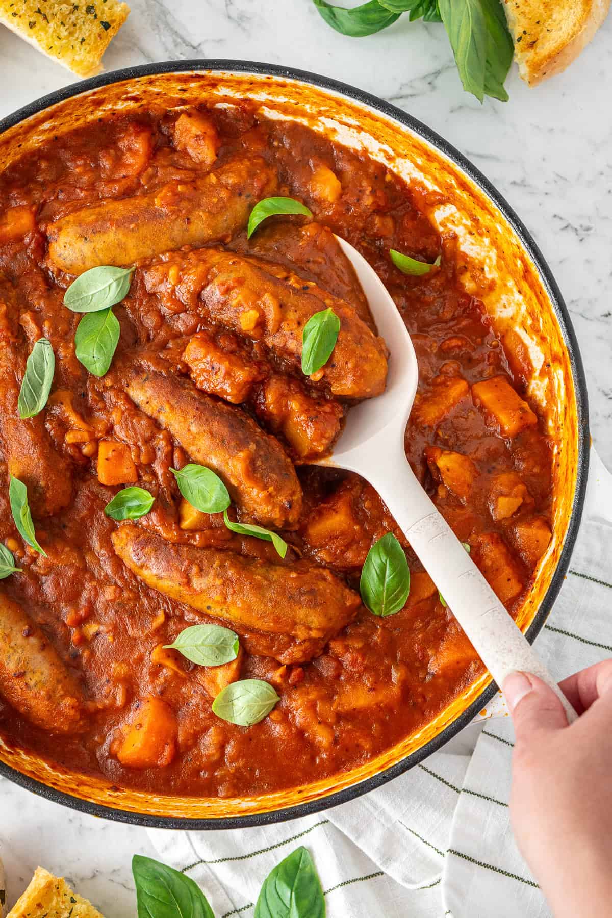 This recipe is centred around the flavours of the sausages and they are an important part of this recipe so I do not recommend substituting here. If you did want to try vegetarian sausages and a beef-style stock instead then that would probably be your best option however I haven’t tested it so I cannot guarantee you’ll get similar results.