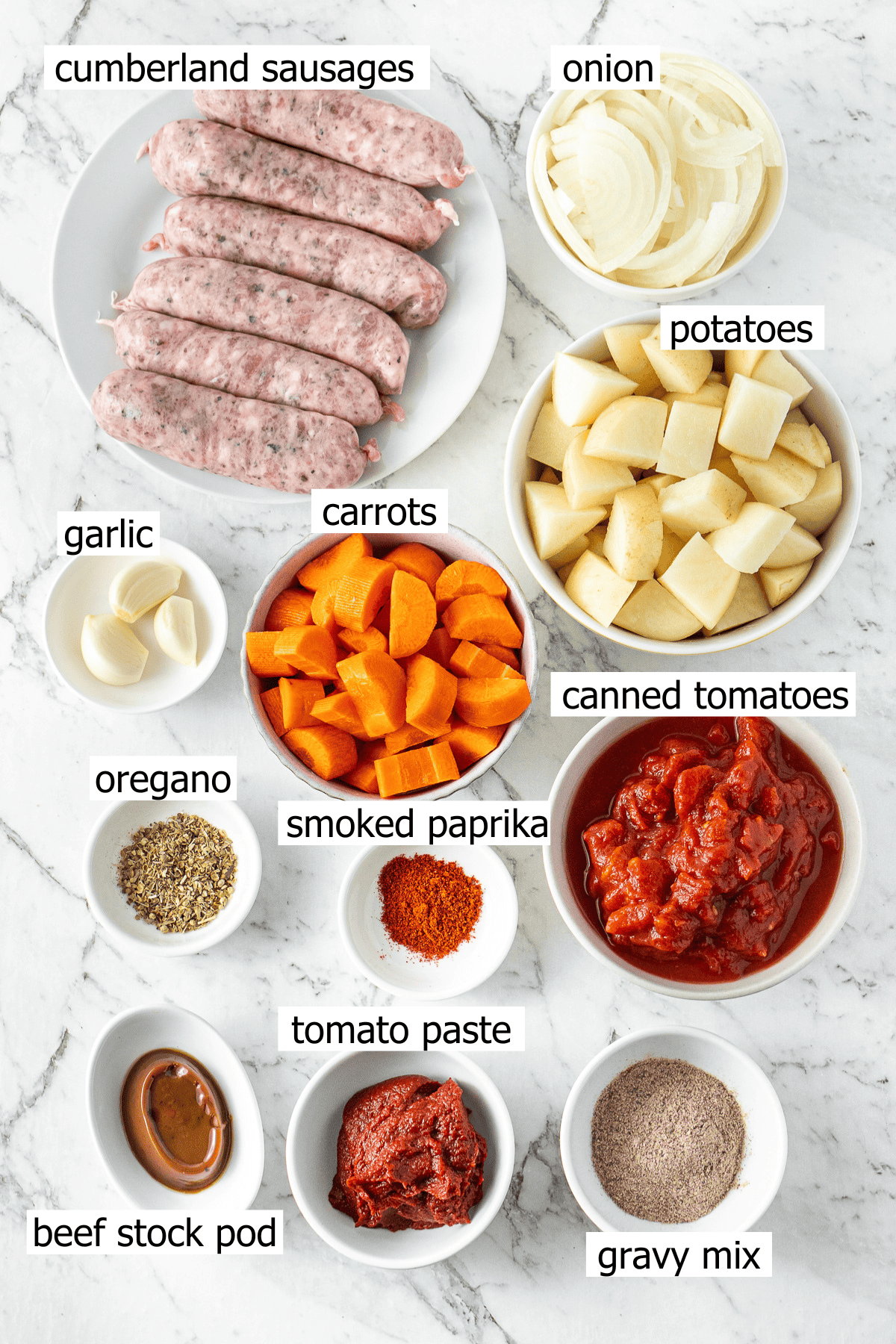 - Cumberland sausages – a pork sausage originating from England and one of my favourite varieties. I love the extra flavour these add to the meal but you can really just use any you like.