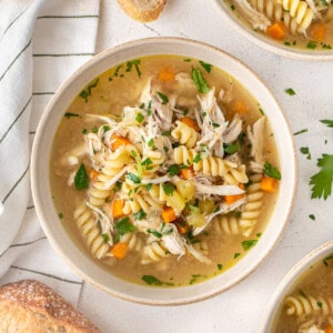 To make ahead, simply just leave out the noodles and freeze the soup for up to 3 months. To serve, defrost and heat up the soup and serve with cooked pasta.