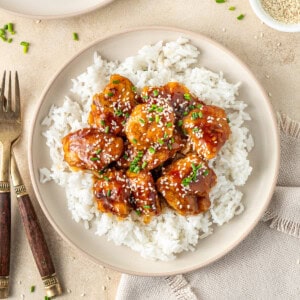 As the sweet chilli chicken is quite rich, it is perfect served with steamed white rice or jasmine rice. If you want to add some veg, keep it simple with some stir-fried greens like bok choy or steamed broccolini. You can also serve it with a simple quick pickled cucumber which would be delicious (use the recipe from my hot honey chicken bowls).