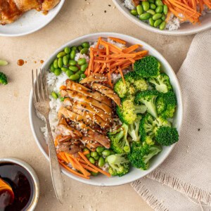 Finally, assemble the bowls with some rice, the cooked broccoli, edamame and the teriyaki chicken that’s been sliced. Top with sesame seeds and an extra drizzle of teriyaki sauce!