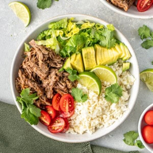 This beef burrito bowl combines my favourite slow cooked Mexican pulled beef with zesty lime cauliflower rice, avocado, and salad to create a delicious, healthy, and satisfying dinner. It’s low-carb, Whole30-approved, and suitable for a range of diets, making it a great addition to your regular meal rotation.