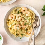 This 15 minute creamy garlic prawn pasta is a super easy but delicious dairy free dinner that is sure to impress on a busy weeknight. This indulgent pasta dish has a light and creamy, garlic infused sauce with tender, sweet prawns. It’s perfect for when you’re craving a comforting, creaming pasta, or for an easy date night dinner with a glass of sparkling.