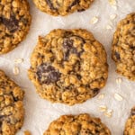 These banana oat chocolate chip cookies are soft, chewy, and filled with the sweet flavour of ripe bananas and melty dark chocolate. They’re an easy and delicious way to use up overripe bananas, using simple pantry staple ingredients. A little like banana bread, but in cookie form.