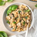 This one pot creamy chicken and bacon pasta is so easy to make and comes together in just 30 minutes! The pasta cooks in the one pot along with the sauce meaning not only an easier clean up, but a flavourful and ultra creamy pasta that is also unbelievably dairy free! You’ll love this easy pasta recipe for busy weeknights where you need something quick and easy but still comforting and delicious!