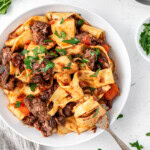 Once the beef is tender, remove the thyme sprigs. Add the cooked lasagna noodle strips to the ragu, gently tossing to combine. Season with salt and pepper to taste, and serve immediately, garnished with freshly chopped parsley.