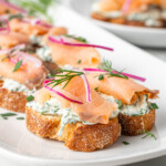 These easy and delicious smoked salmon crostini are a simple appetiser or snack perfect to share with friends and family. With the classic combination of salmon and cream cheese, elevated with fresh herbs and the delicious crunch of the toasts. They are also made dairy-free and come together in less than 20 minutes!