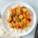 Spoon the sweet and sour chicken over cooked rice. Sprinkle with sesame seeds and sliced spring onions.