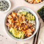These teriyaki salmon and avocado rice bowls are one of my favourite easy and healthy recipes to make for lunch or dinner. With tender salmon, creamy avocado, and sticky rice, all topped with a sweet and rich homemade teriyaki sauce, this delicious meal comes together in just 20 minutes!